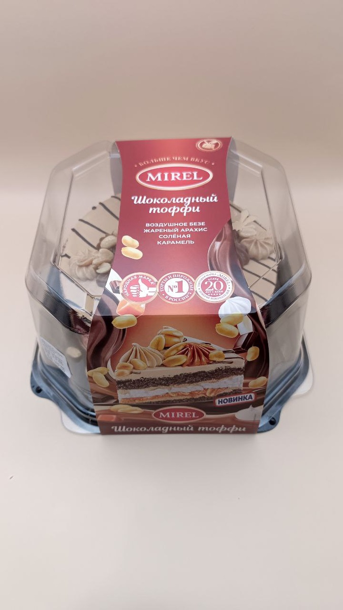 Всем привет, дорогие друзья! Сегодня я снова скажу, что не люблю сладкое, но буду пробовать и рассказывать о приторно сладком тортике! Кажется, я обманываю сам себя... Итак, сегодня на обзоре торт “Шоколадный тоффи” от известной компании “Mirel”. Фирма известная, десерты и торты делает неплохие, пусть и немного без души, для масс-маркета, Тортик давно привлекал своим видом и меня и Вику. И не только видом, который открывается нам сквозь прозрачную упаковку, но и надписью “новинка”, которая выполнена в стиле надписи на батончиках "Сникерс". А "Сникерс" мы любим. Особенно я. Итак, погнали! Покупали в "Пятёрочке", по акции за 650 рублей. Цена не маленькая, на мой взгляд. Проверим, стоит ли оно того. Состав следующий: начинка вареная сгущенка (сахар, заменитель молочного жира (растительные масла, антиокислитель (концентрат смеси токоферолов), молоко, мальтодекстрин, загуститель (альгинат натрия), краситель (сахарный колер), ароматизаторы, стабилизатор (ксантановая камедь), консервант (со