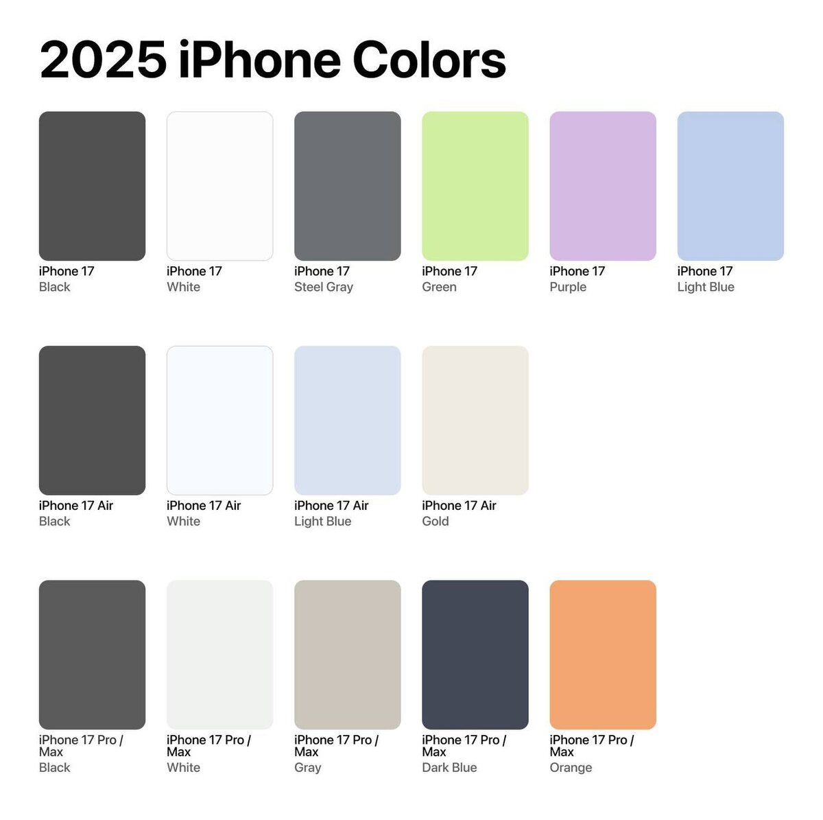 В сеть слили расцветки всех моделей iPhone 17.
