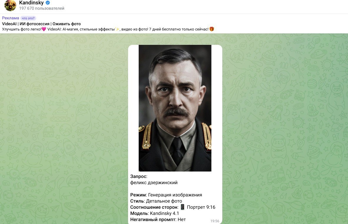Вот как, по мнению нейросети Кандинский, выглядит Феликс Эдмундович Дзержинский. Она, кстати, упорно отказывается генерировать изображения с гербом ФСБ или формой организации.