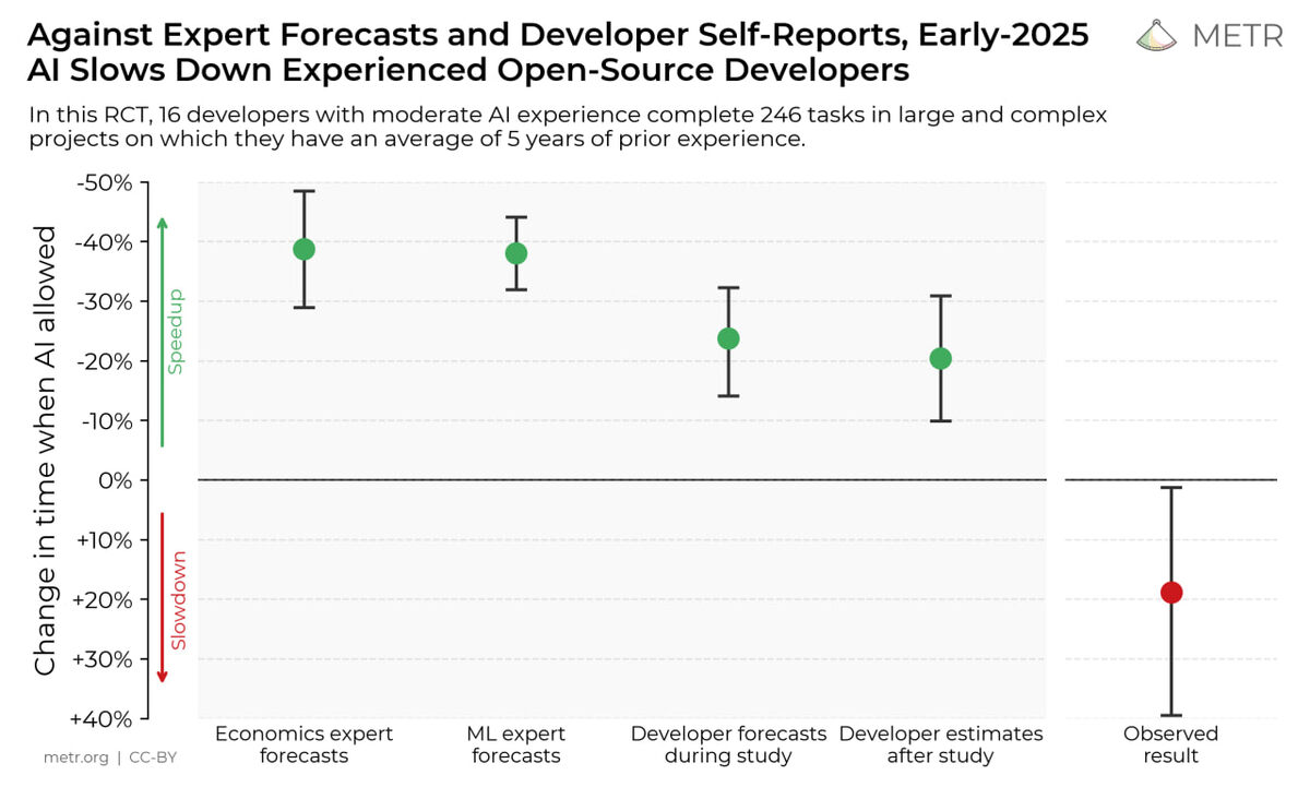 В июле 2025 года на портале Metr.org появилось свежее исследование, которое уже вызвало оживлённые дискуссии в IT‑сообществе. Результаты эксперимента, казалось бы, идут вразрез с общепринятым мнением о том, что искусственный интеллект ускоряет работу программистов. Суть открытия проста, но эффектна: опытные разработчики, работавшие с ИИ в реальных условиях и в рамках своих же крупных проектов, выполняли задачи на 19% медленнее, чем без таких инструментов. И это не единичный случай — экспериментальная база оказалась достаточно представительной. В испытании участвовали 16 опытных инженеров. Все они ежедневно трудятся в больших проектах и знают внутреннюю кухню сложных продуктовых систем. В ходе эксперимента им предложили выполнить около 250 стандартных рабочих задач — от улучшения функционала до исправления багов. Казалось бы, подобный объём рутинной работы — идеальная почва для применения современных ассистентов на базе ИИ. Но результат удивил самих участников и авторов исследования. По