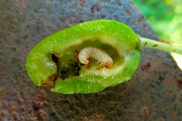 - Личинки вылупляются в конце цветения и проникают внутрь завязей, где их можно обнаружить.