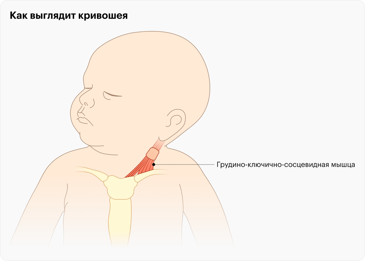 Кривошея — состояние, при котором голова ребенка вынужденно наклоняется к одному из плеч, потому что ее тянут мышцы шеи. То есть макушка головы наклонена в одну сторону, а подбородок развернут в другую.