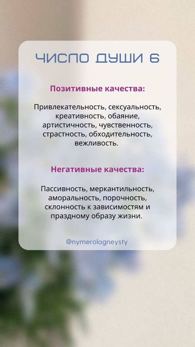 Обладатели Числа Души 6 – это воплощение красоты, чувственности и творческого огня! Ваша сущность пропитана энергией Венеры, стремлением к гармонии и умением очаровывать мир. 🔮 Позитивные качества Числа Души 6 (Ваша Неотразимая Сила!): Эти сильные стороны делают вас центром притяжения, источником вдохновения и творцом уюта! Если какие-то позитивные качества пока раскрыты не в полной мере – ваша планета-покровитель поможет вам раскрыть их с изяществом и грацией. Наполняйте мир красотой! ⚠️ Негативные качества (Зоны Роста для Числа 6): Важно понимать: Эти тенденции – не приговор, а "теневая сторона" вашей прекрасной энергии Числа 6, связанная со страхом потерять комфорт, красоту или доступ к удовольствиям, а также с вызовом найти истинный баланс между духовным и чувственным. Чрезмерное стремление к гармонии может обернуться пассивностью, а любовь к красоте – в поверхностность или зависимость от нее. Над этими качествами Шестеркам особенно важно работать, развивая внутреннюю дисц