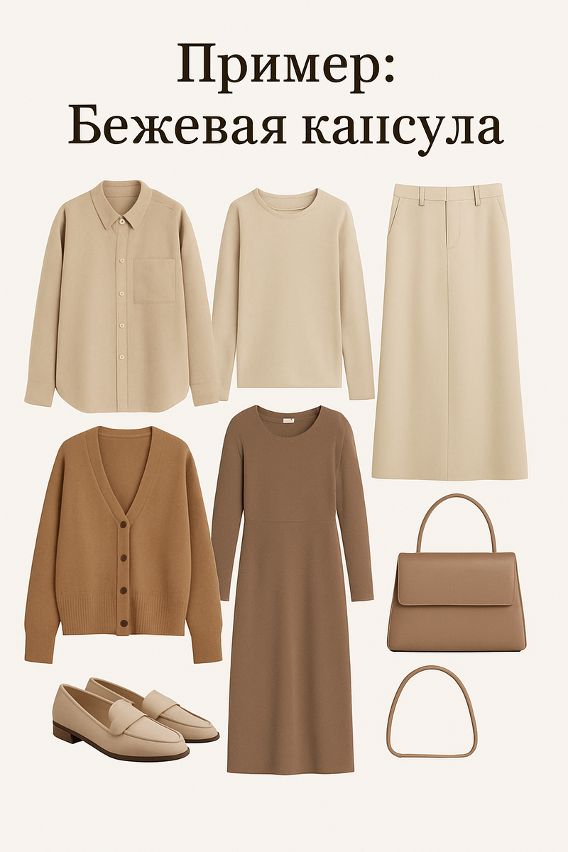 Выбор цвета — основа капсулы. Это должен быть оттенок, который: 🔹 Совет: начните с нейтрального цвета, если только осваиваете капсульный подход. Мини-капсула может включать от 6 до 12 предметов, которых будет достаточно для десятков сочетаний. Примерная формула: Один цвет — не значит монотонность.