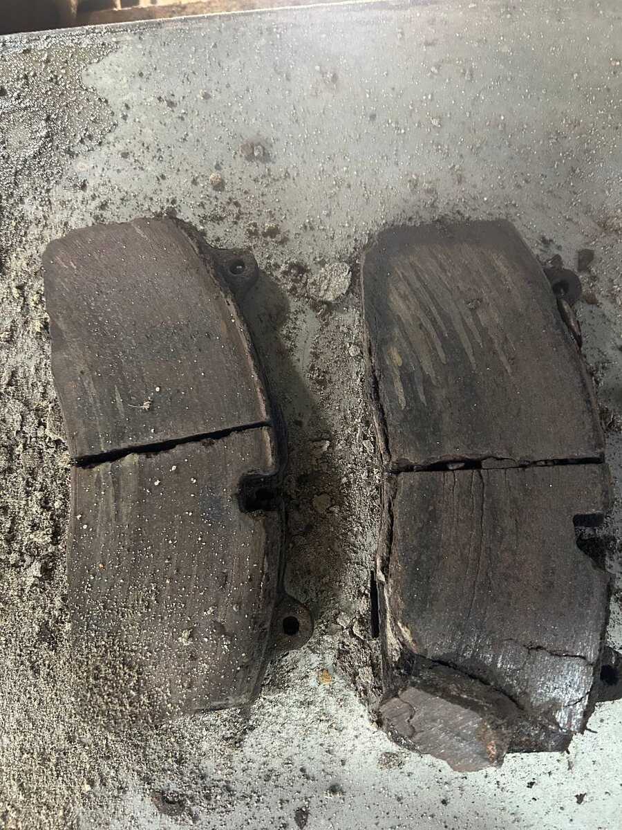 Равномерность износа: Износ внутренней и внешней колодки должен быть примерно одинаковым. Неравномерный износ или потрескавшиеся колодки (например, одна колодка стерта сильнее) указывает на проблемы с направляющими пальцами суппорта или заклиниванием поршня.