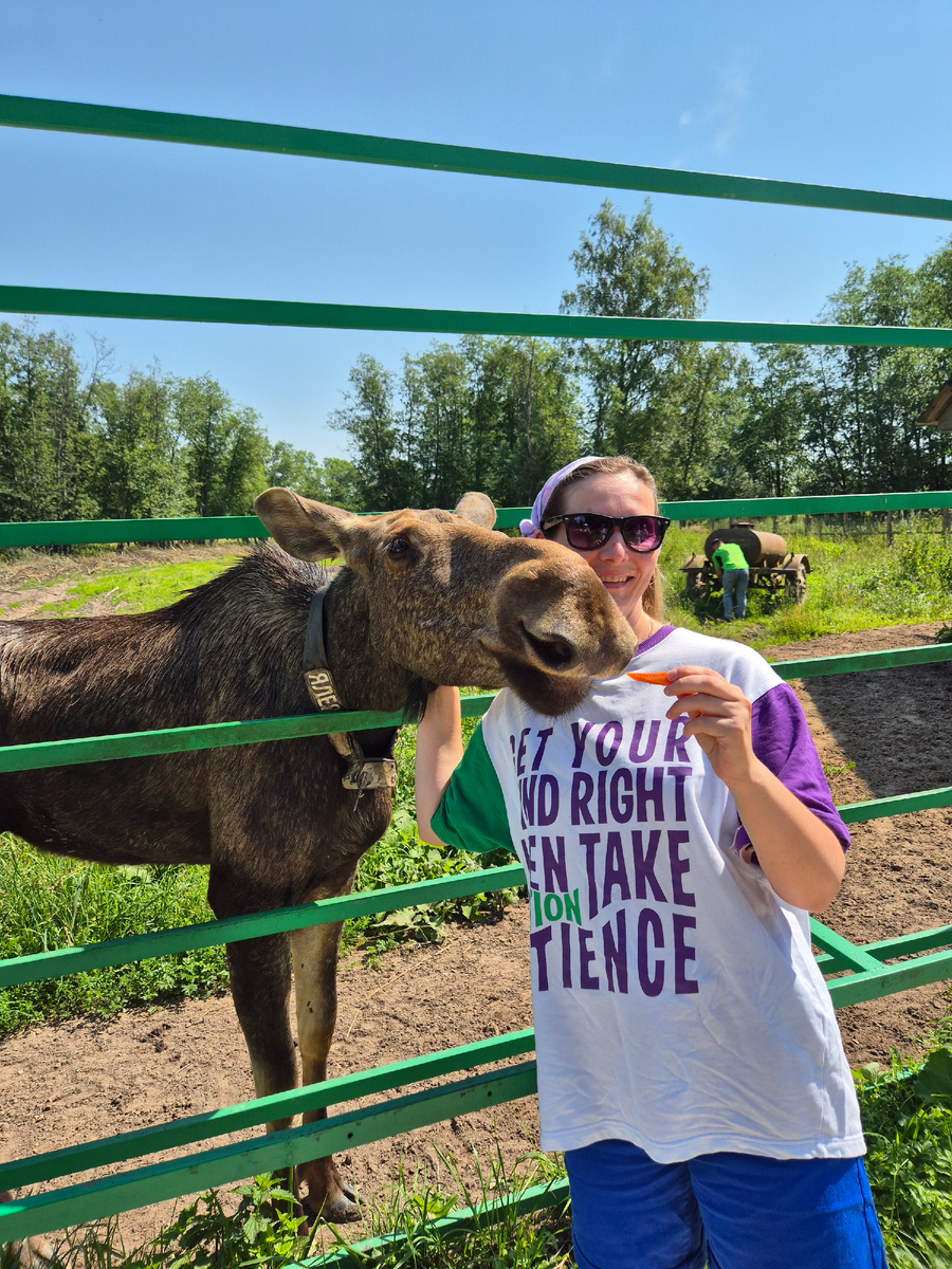 Сумароковская лосиная ферма - самая большая лосиная ферма в мире! Эта ферма была основана в 1963 году и она удивительна тем, что все животные здесь содержатся не в загонах, а на свободном выпасе. Лоси имеют свободный выход в лес и возвращаются по сигналу. У каждого лося на шее есть бейджик с именем и пеленгатор для отслеживания их передвижения. Лосеферма открыта для посещения ежедневно с 10:00 до 15:00 летом и с 10:00 до 13:00 зимой. Такой график связан с тем, что вечером лоси обычно уходят в лес. Абсолютно безопасно кормить лосей с рук даже детям, поскольку у них отсутствуют верхние передние зубы и клыки, и, следовательно, они не могут укусить. На ферме нам сразу выдали свежую морковку и мы пошли их кормить. Лосята здесь содержатся отдельно от взрослых особей и даже от своих матерей. Когда в хозяйстве рождается лосенок, его сразу забирают от матери и начинают кормить из бутылочки. Доярку, которая ежедневно ходит доить лосиху, она принимает за своего детеныш