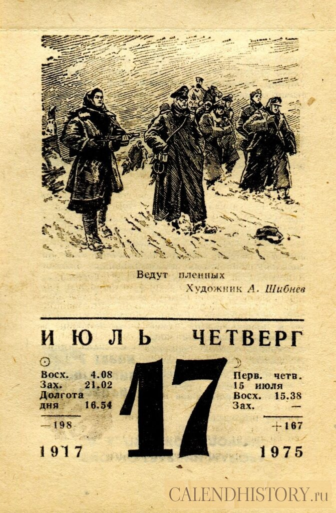 Итак, сегодня 17-го июля и у нас на календаре 1975-й год. Перед нами листок советского календаря для женщин. На календаре у нас четверг - 17 июля 1975-го года. Ведут пленных Художник А. Шибнев *** Оборотную сторону листка этого календаря можно посмотреть у нас по ссылке на сайте. Другие листки советских календарей смотрите у нас на сайте - CALENDHISTORY.ru ПОСМОТРИТЕ ЕЩЁ ЛИСТКИ ОТРЫВНЫХ КАЛЕНДАРЕЙ: