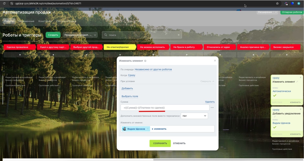 Для этого, на нужной стадии сделки мы размещаем робот Изменить элемент, где в настройках указываем следующее: