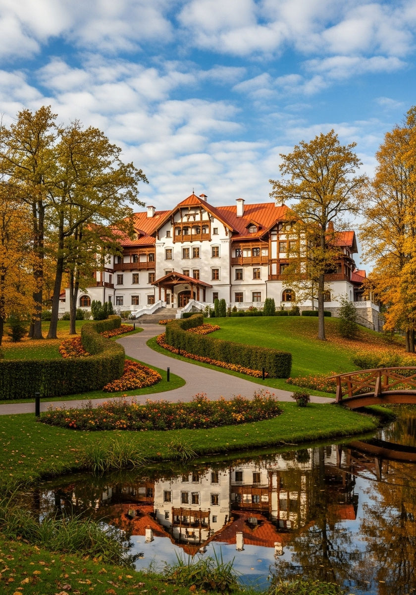 Отель предлагает 50 номеров повышенной комфортности с респектабельными интерьерами в стиле XIX века. На территории работает полноценный SPA-центр с более чем 250 видами процедур, аквацентр с бассейном, ресторан и бар. Гости особенно ценят расположение в минуте ходьбы от оборудованного парка на берегу Псковы, где можно делать красивые фотографии.