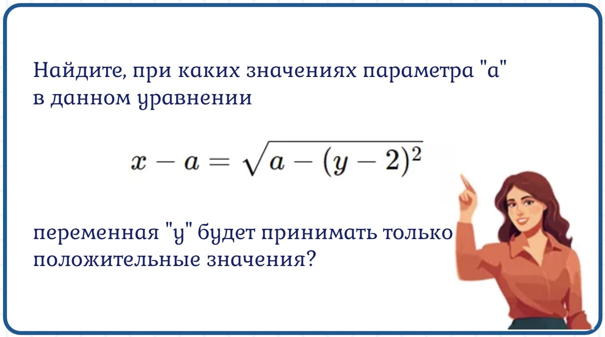 В этой статье разберём интересную задачу с параметром, в которой нужно выяснить, при каких значениях параметра переменная y принимает только положительные значения. Задача отлично подходит для подготовки к ЕГЭ или олимпиадам по математике, особенно в теме "Параметры и область определения". Она не очень сложная, поэтому подойдет тем, кто только недавно начал изучать тему параметров в уравнениях. Здесь мы посмотрим как на аналитическое решение, так и на работу с графиком. Уравнение (которое является уравнением функции х(у) ) содержит квадратный корень. Чтобы выражение под корнем было определено, подкоренное выражение должно быть неотрицательным: Теперь мы знаем, какие значения "y" в принципе возможны при заданном "a". Осталось понять, когда все они положительные. Нам нужно, чтобы весь отрезок, на котором y может находиться, лежал в положительной части числовой прямой. А значит, нижняя (левая) граница отрезка должна быть больше 0: Итак, при всех значениях a∈[0;4) переменная y принимает т