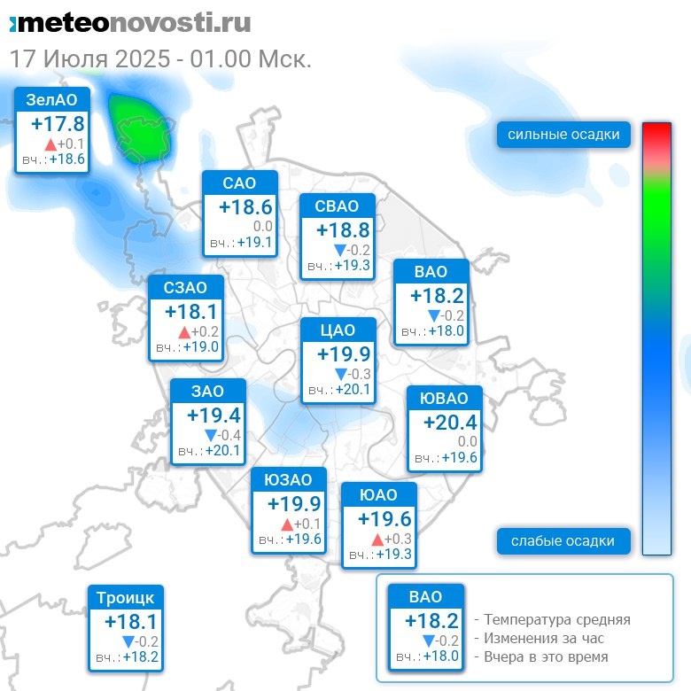 В 1:00 в Москве было от +17.1°C до +20.7°C, средняя температура +19°C #погода #Москва #лето #температура #17июля #четверг