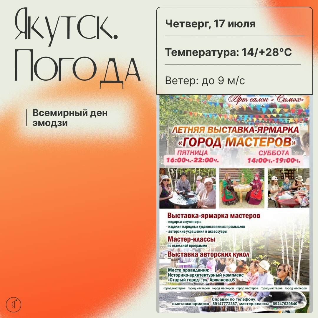 Доброе утро 🤩 В Якутске пройдет выставка-ярмарка «Город Мастеров» 🤩🤩🤩 Вас ждёт: 🤩 Ярмарка уникальных изделий ручной работы 🤩 Мастер-классы от якутских ремесленников 🤩 Выставка авторских кукол 🤩Живая концертная программа 🤩18 июля: 16:00–22:00 🤩19 июля: 14:00–19:00 🤩Историко-архитектурный комплекс «Старый город», ул. Аржакова, д. 6 Подробная информация на сайте Центра "Симэх" Почувствуйте атмосферу народных традиций и найдите особенные сувениры для себя и близких 🤩 Online Якутия | Подписаться