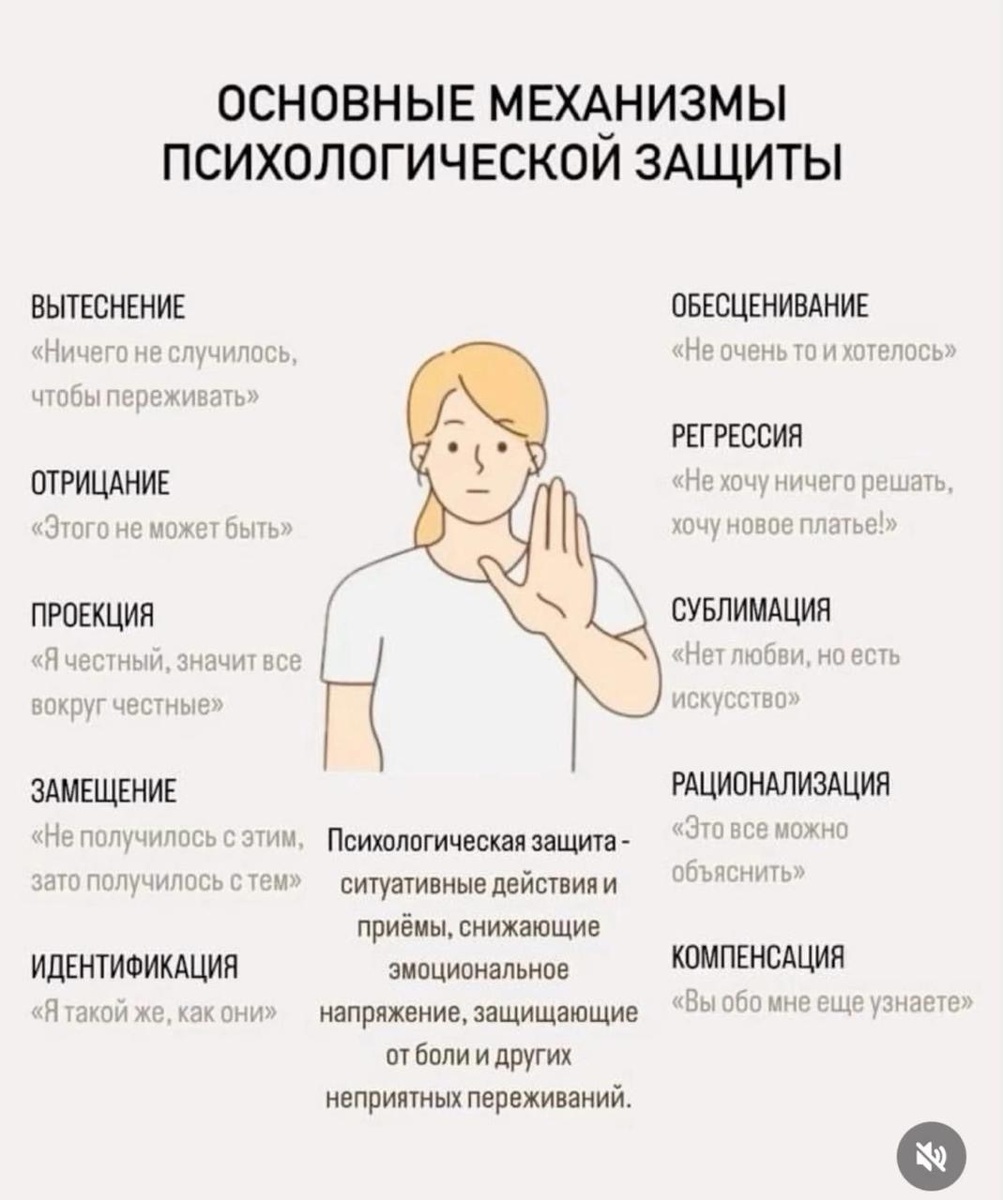 🛡️ Это механизмы, которые наш разум использует для защиты от негативных эмоций, стресса и внутреннего конфликта. Они помогают нам справляться с трудными ситуациями, облегчая эмоциональную нагрузку. Важно понимать, что эти механизмы могут быть как полезными, так и вредными.