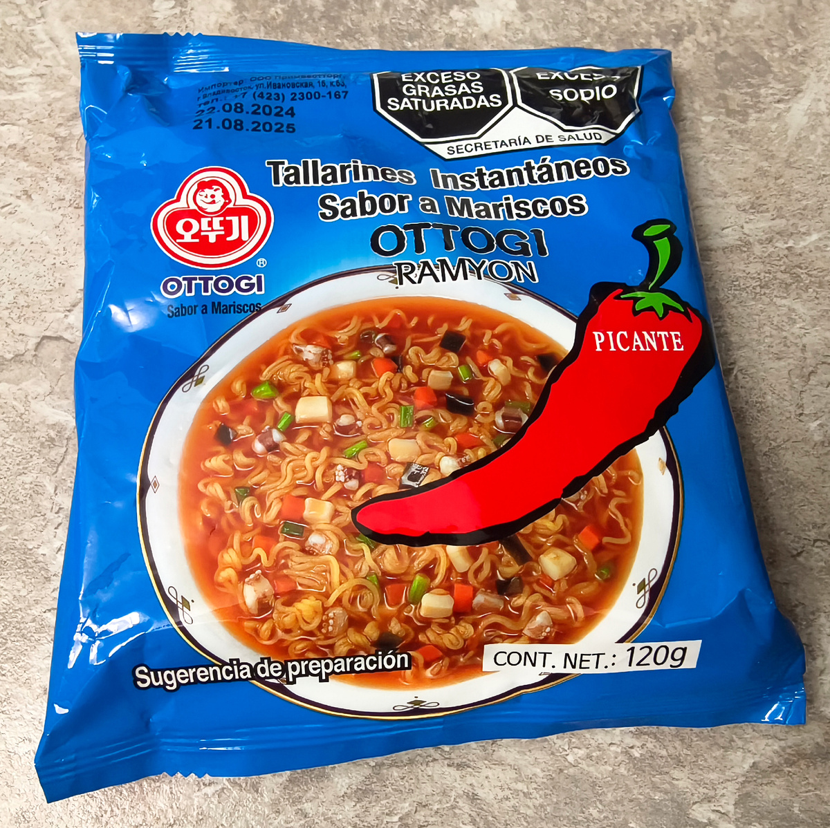 Всем привет! Заказал на маркетплейсе лапшу Оттоги со вкусом морепродуктов. Обошлась в 120 рублей. Возможно это вариант для Испании, так как переводчик показал испанский язык на упаковке. Интересно. Масса 120 граммов. А для нас есть стикер. Изготовлено в Корее. Импортер: ООО "Примвестторг", г. Владивосток. Лапшу нужно варить. Состав длинный. Даже в лапшу напихали кучу добавок. В комплекте брикет лапши. Суповая основа и сушеные овощи. Пакетики не очень большие. Варю по инструкции до размягчения лапши. Получается вот такой вариант. Бульон ароматный. Перечно-креветочный. А вот на вкус мне не понравился. Он пустой. И к тому же невыносимо острый для меня. Как будто сварили креветочный бульон, добавили немного соли и очень много красного перца. Так, что даже у бульона получился вкус красного перца сильнее, чем морепродуктов. Бывает когда остро, но вкусно. Тогда я ем с удовольствием. Здесь же наоборот. Очень остро и не вкусно. Я не хотел страдать просто так и почти ничего не съел