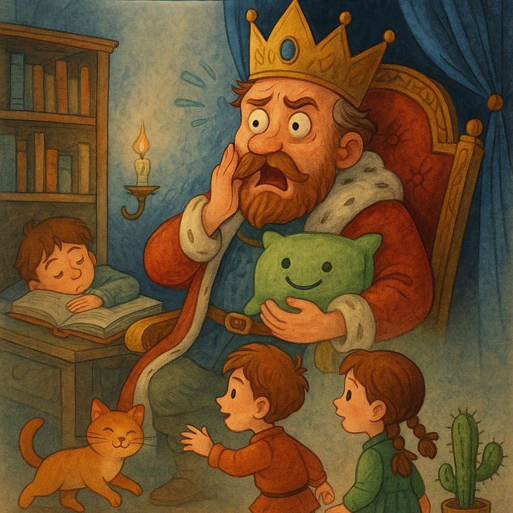 Сказка «Король, который запретил подушки» В королевстве Сонлянде жил король по имени Грюмп Второй. Он был строг, бодр и очень не любил, когда кто-то без дела валялся. Особенно его раздражали… подушки. — Из-за этих мягких гадостей люди ленятся! — бурчал он. — Спят долго, улыбаются во сне и совсем не ходят на утренние построения! И вот однажды он подписал королевский указ №1023/ЛОП: «С завтрашнего утра — ни одной подушки в стране! Ни пуховой, ни перьевой, ни даже диванной!» Слуги собрали все подушки — от замка до последней деревушки. Люди пытались спать на свитках, на тыквах, на носках… Кто-то лёг прямо на кошку (мурчание помогало, но недолго). А кто-то — на кактус. Этот эксперимент закончился плачевно. Самое страшное началось через пару ночей. Сны… исчезли. Ни один ребёнок не видел больше сказочных морей, летающих китов или говорящих пирожков. Всё стало пусто и тихо. Сны — испуганные, нежные и ранимые — убежали в соседнее королевство Фантазарию, где подушки не трогали. Но больше