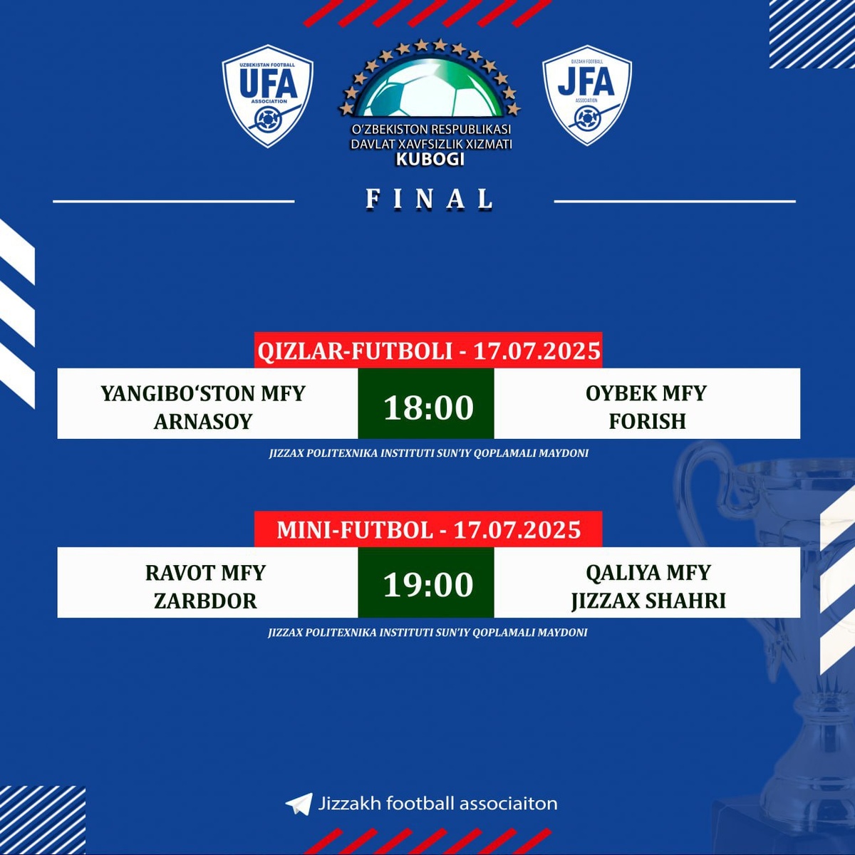 Бугун футбол бўйича ДХХ кубоги Жиззах вилояти ғолиблари номи аниқ бўлади Қизлар футболи ва мини-футбол бўйича финал ўйинларини ўтказиб юборманг ⚽️Жиззах политехника институти стадиони ⏰18:00 дан бошлаб Каналимизга обуна бўлинг ва энг сўнгги янгиликларни кузатиб боринг. Jizzaxnews |Тelegram | Facebook | Dzen | YouTubе