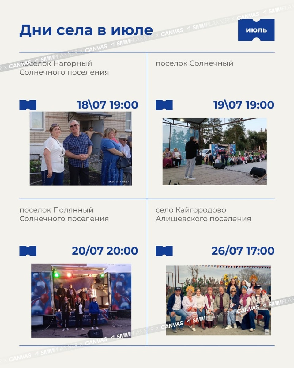 Рассказываем в каких населенных пунктах в ближайшее время пройдут праздники Дни села 18\07 19:00 поселок Нагорный 19\07 19:00 поселок Солнечный 20\07 20:00 поселок Полянный 26\07 17:00 село Кайгородово Из-за погодных условий в программе возможны изменения. Следите за афишей на ресурсах «Сосновской нивы».