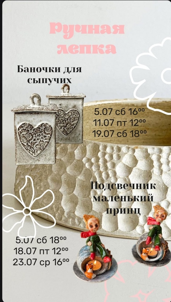 Заскучали? Гончарная школа «Мировой» приглашает на мастер—классы для взрослых и детей! Изготовление изделия, сушка, 2 обжига, покрытие в прозрачную глазурь 📍Чкалова 135, 3-й этаж, кабинет 309 🕐Ближайший мастер-класс «Подсвечник Маленький принц» 18 июля в 12:00 🪙От 1500 рублей Обязательная запись по номеру 89141329691. #Афиша Предложить публикацию: @zabkulisye_bot