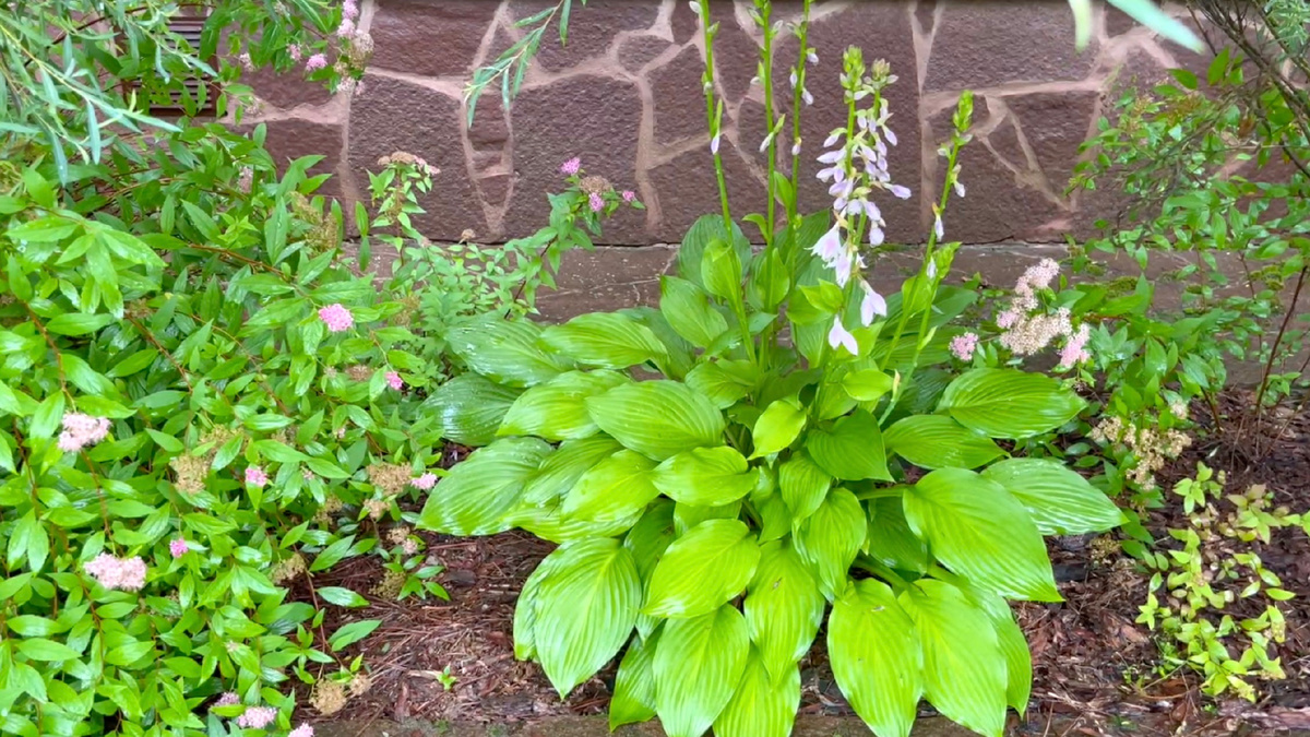 Многие растения пострадали от града, но некоторые, растущие под защитой кустарников, остались сохранными. Например, видовая хоста, спрятавшаяся под кроной ивы пурпурной.