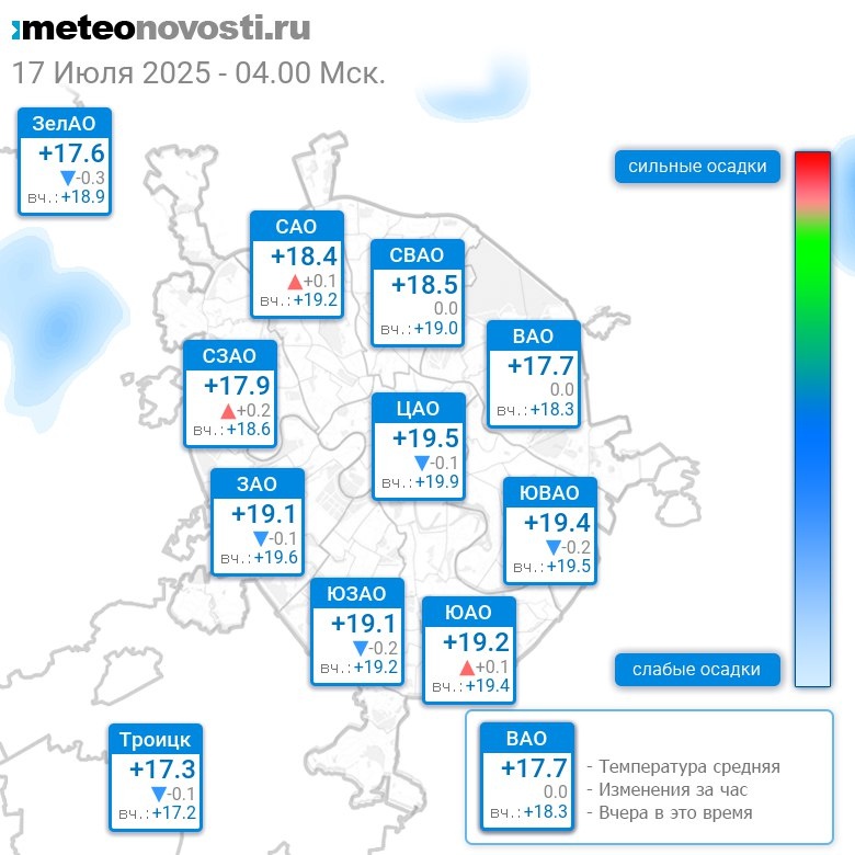 В 4:00 в Москве было от +16.4°C до +19.8°C, средняя температура +18.5°C #погода #Москва #лето #температура #17июля #четверг