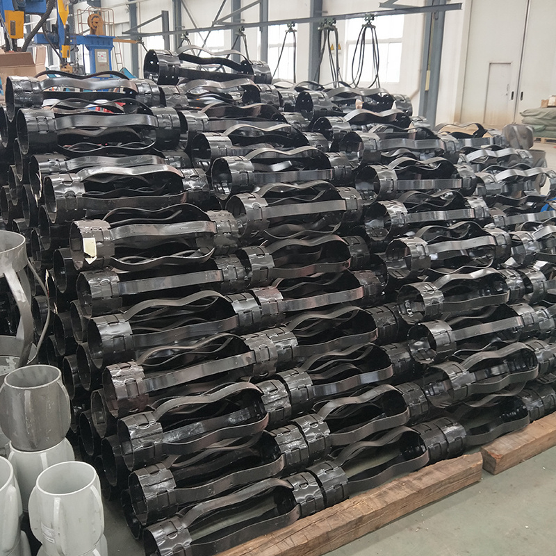 - 2. Пружинный лист (или опорный компонент): Это важный компонент центратора, который может играть роль поддержки и позиционирования. Пружинный лист равномерно распределяется вокруг самого центратора и адаптируется к обсадным трубам разных диаметров посредством упругой деформации. Для интегрального инструмента для снятия обсадных труб средняя часть трубы центратора равномерно распределяется с дугообразными опорными пластинами, выступающими наружу. Которые также играют роль поддержки и позиционирования.