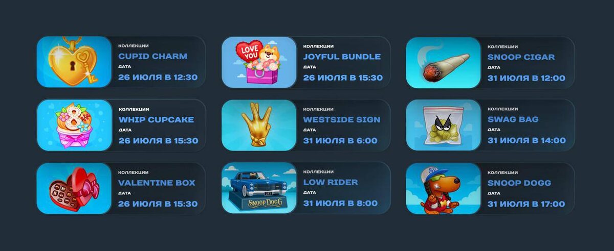Выход подарков на площадки Опубликовано расписание, когда новые подарки станут доступны для передачи другим пользователям и размещения на маркетах: Cupid Charm — 26 июля в 12:30 Joyful Bundle — 26 июля в 15:30 Whip Cupcake — 26 июля в 15:30 Valentine Box — 26 июля в 15:30 Westside Sign — 31 июля в 6:00 Low Rider — 31 июля в 8:00 Snoop Cigar — 31 июля в 12:00 Swag Bag — 31 июля в 14:00 Snoop Dogg — 31 июля в 17:00 1. Portals - (покупка/продажа подарков) 2. Tonnel - (покупка/продажа подарков)*есть Pre-Market 3. MRKT - (покупка/продажа подарков)*есть Pre-Market 4. Split - (покупка звезд, через крипту и Фиат) 5. Gift Charts - (отслеживание график цен) 6. StarSwap - (обмен звезд на крипту)