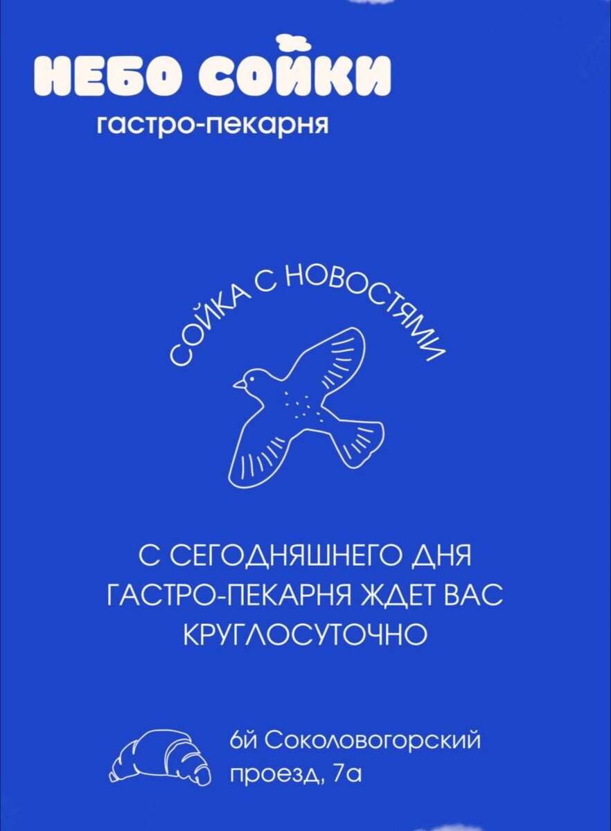 Пекарня «Небо сойки» (6-й Соколовогорский проезд, 7а) перешла на круглосуточный режим работы, сообщает Мамука Топчишвили.