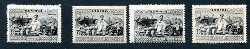 Те же 4 марки с оборотной стороны. Для проверки правильности Вашего выбора. Ну и комментарий о культуре коллекционирования. Марку с наведенным клеем вычислили?