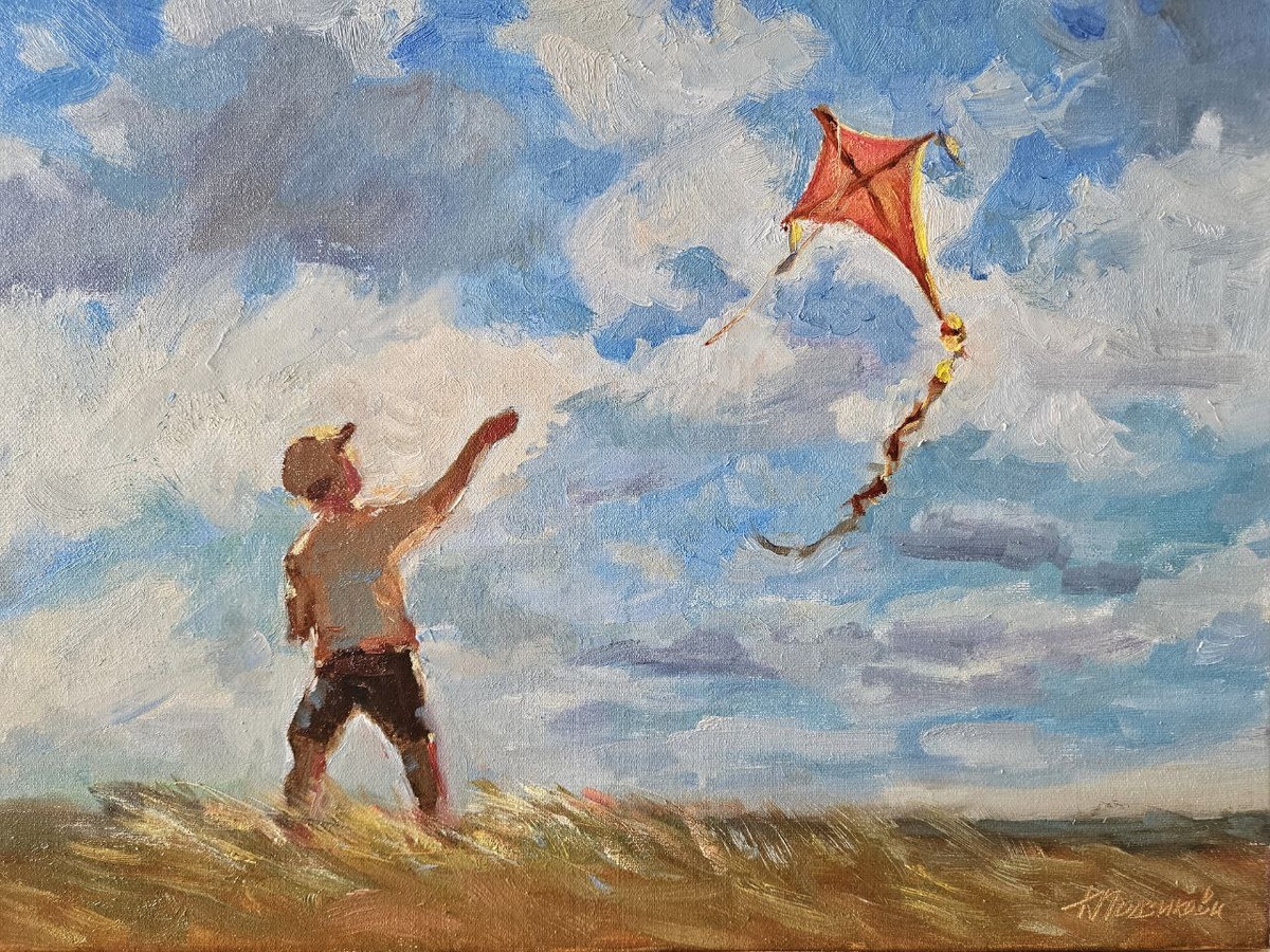 🖼 НЕБО БЛИЖЕ, ЧЕМ КАЖЕТСЯ холст / масло 30×40 см На картине мальчик бежит по золотистому полю, а его воздушный змей взмывает в ярко голубое небо. Солнце освещает всё вокруг, и кажется, будто сам ветер помогает змею подняться ещё выше. Этот полёт напоминает нам, что мечты могут подниматься так же легко, если верить в них. Иногда змей опускается, но мальчик снова бежит, и ветер с радостью наполняет его крылья. Пусть эта картина вдохновляет вас не бояться мечтать. Ведь стоит только захотеть, расправить воображаемые крылья, и тогда даже самое далёкое небо станет ближе! Картина участвует в коллекции ИСКУССТВО ДЛЯ ШЕРЕДАРЯ «Шередарь» – это лагерь, который помогает ребенку перестать быть заложником болезни и открывает двери в новую жизнь. А вы можете помочь наполнить его искусством.