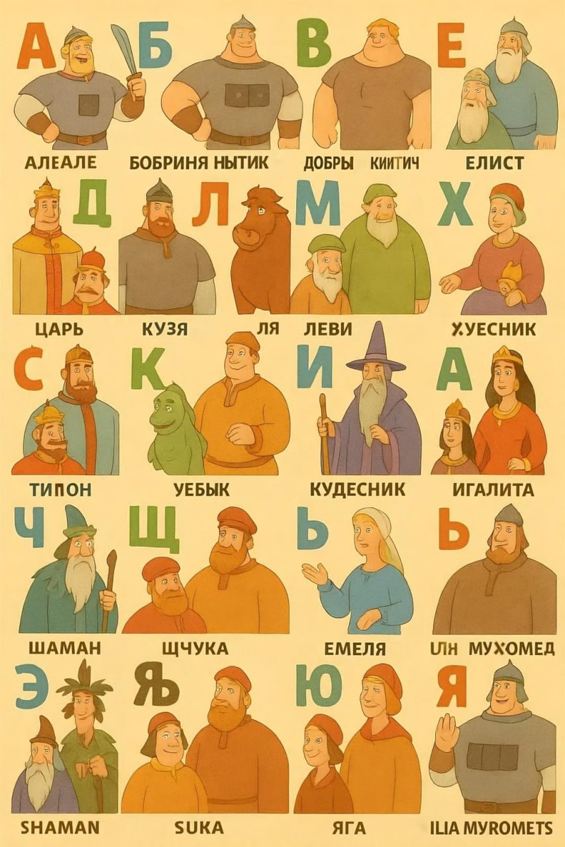 Бобриня Нытик: ChatGPT попросили сгенерировать алфавит с русскими богатырями. Получился сущий кошмар.