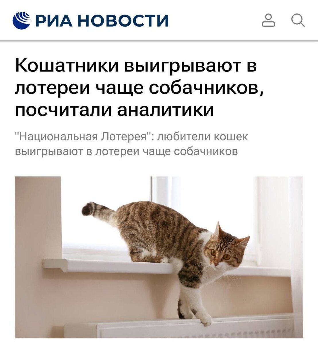 Аналитики Национальной лотереи подсчитали, что среди людей, выигравших более 1 миллиона рублей, у 77% есть кошки, а у 23% — собаки.