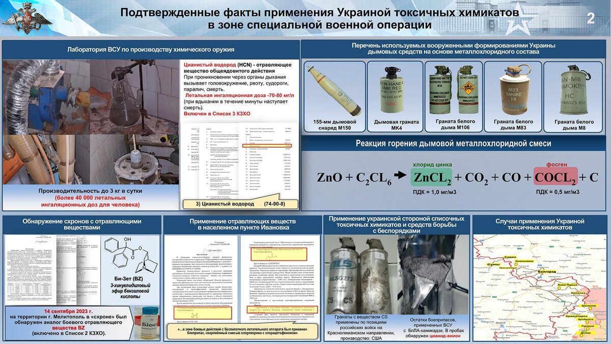 В ходе спецоперации Россия зафиксировала более 500 случаев применения украинской стороной химических средств борьбы с беспорядками (хлорацетофенон, CS), а также отравляющих веществ психотропного (BZ) и общеядовитого действия (хлорциан, синильная кислота).