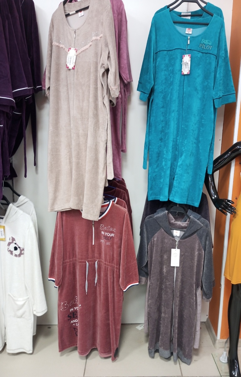 Как человек, который знаком с Ивановскими производителями текстиля и трикотажа, я раз в какое-то время стараюсь заходить в магазины с таким названием. Вызвано это, конечно, воспоминаниями об удачных покупках и низких ценах, но зачастую в последнее время мне попадается одна ерунда, так она еще и стоит столько, что проще вернуться домой, открыть любой маркетплейс и выбрать что-то более удачное по всем параметрам. Правда зачастую все визиты в "Ивановский текстиль" до этого сопровождались одной фразой - дорого, но сегодня было приятное исключение. Я просмотрела большую часть ассортимента, обратила внимание преимущественно на одежду, т.к. комплекты постельного белья были почему-то от других производителей и по ценам в 10 тысяч и более, и, знаете, периодически ловила себя на мысли, что цены-то низкие. Правда зачастую и качество такое же. Но давайте я лучше покажу, что нашла и какие впечатления остались, даже интересно, какую оценку вы бы поставили такому ассортименту: Халаты - это прямо-таки