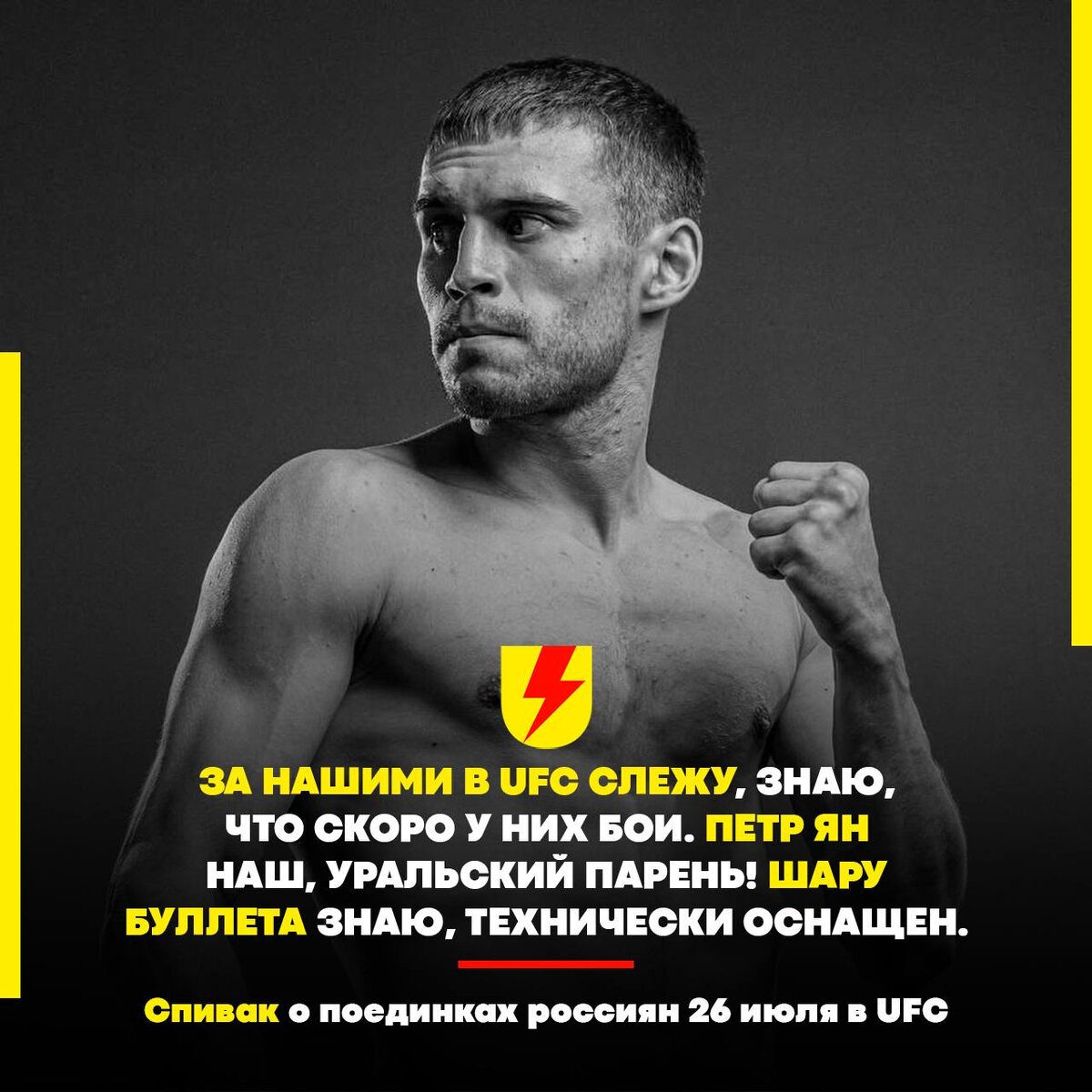 Чемпион TOP DOG Спивак: “Всегда интересно наблюдать за российскими бойцами в UFC. Желаю победы Петру Яну и Шаре Буллету!” Остается чуть больше недели до громкого турнира UFC в Абу-Даби, и фанаты единоборств уже ждут бои Петра Яна и Шары Буллета. Вместе с ними их ждет новый чемпион TOP DOG в 59 кг, Дмитрий Спивак. Он дал свою оценку предстоящим боям и пожелал успехов нашим ребятами: 💬 “Мне всегда интересно наблюдать, как развиваются и прогрессируют российские бойцы. За нашими ребятами в UFC я слежу, знаю, что скоро у них бои. Смотрю соцсети Петра Яна, знаю, что это наш, уральский парень. Шару Буллета тоже знаю, он технически очень хорошо оснащен. 💬Посмотрел соперников, что у Петра ,что у Шары. Думаю, наши парни должны забирать бои. Проходить на классе, так скажем. Как я понимаю, оба рвутся к титульным боям. Поэтому нужно аккуратно, грамотно, без большого риска отработать. Ребятам желаю победить 26 июля в Абу-Даби!” @teleudar