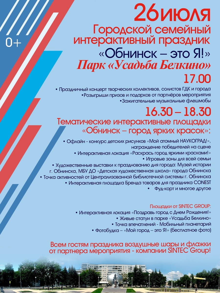 🎉 Отметим День города вместе! 🎉 26 июля ждём всех горожан и гостей Наукограда в Белкинском парке на семейном интерактивном празднике в честь празднования 69-летия города - «Обнинск – это Я!» 🥳 ✨В этот день лучшие творческие коллективы города создадут на сцене яркую, летнюю атмосферу праздника, а музыкальные флешмобы, розыгрыши призов и подарки от партнёров, порадуют всех гостей мероприятия! 🤩 Организаторы праздника подготовили множество тематических интерактивных площадок «Обнинск – город ярких красок» которые никого не оставят равнодушным. Тематические интерактивные площадки «Обнинск – город ярких красок»: * Интерактивная локация «Раскрась город яркими красками!» 🖍 * Игровые зоны для всей семьи. 👨👩👧👦 Профессиональные аниматоры превратят обычный день в волшебное приключение, полное радости и смеха. * Художественные выставки к празднованию дня города: Музей истории г. Обнинска, МБУ ДО «Детская художественная школа» города Обнинска 🖼 * Точка активностей от Централизованн