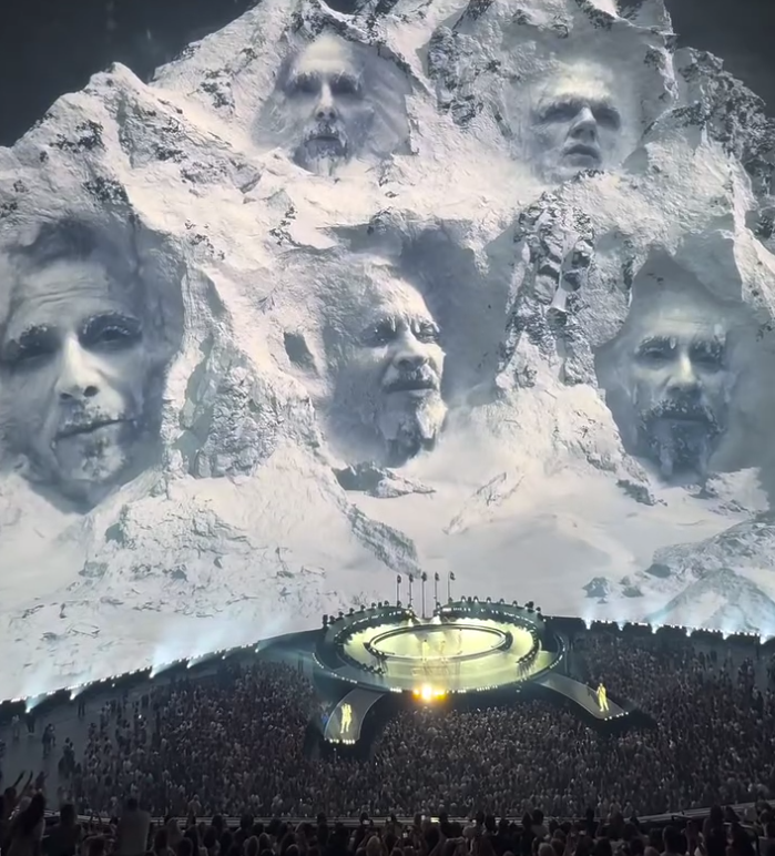 Сама сцена, что-то типа ракеты. Шоу стартует как взлёт в космос. Каждая песня - новая вселенная: от ледяных гор с вырезанными в них лицами участников до вставления интимных домашних архивов. CG-шоу максимально ассоциативное. Оно не просто иллюстрирует треки, как обычно, оно их развивает. Видосы и концерт сливаются в единое мультимедийное месиво, где эмоции предаются не только через звук и ностальжи, но и через окружение. Давайте быть честными, контент забирает на себя ВСЁ, какие бы мы чувства не испытывали к группе))