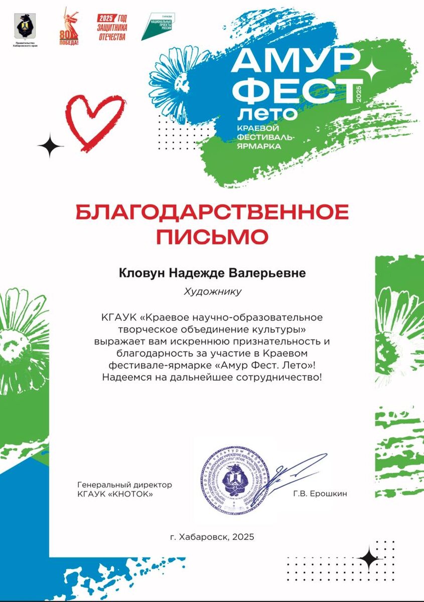 Впервые получаю благодарственное письмо как художник 👩🎨 Очень приятно ☺️ Благодарю команду АмурФест. Сезоны и Творческое объединение культуры | Хабаровск за возможность показать на фестивале своё творчество, увидеть работы других мастеров, познакомиться с другими участниками, почувствовать атмосферу праздника и увидеть реакции на абстракции. Тоже надеюсь 🙏 на дальнейшее сотрудничество) #авторскийрисунокНадеждыSN #авторскиеоткрыткиНадеждыSN #благодарность #Амурфест2025 #ЛетонаАмурфест