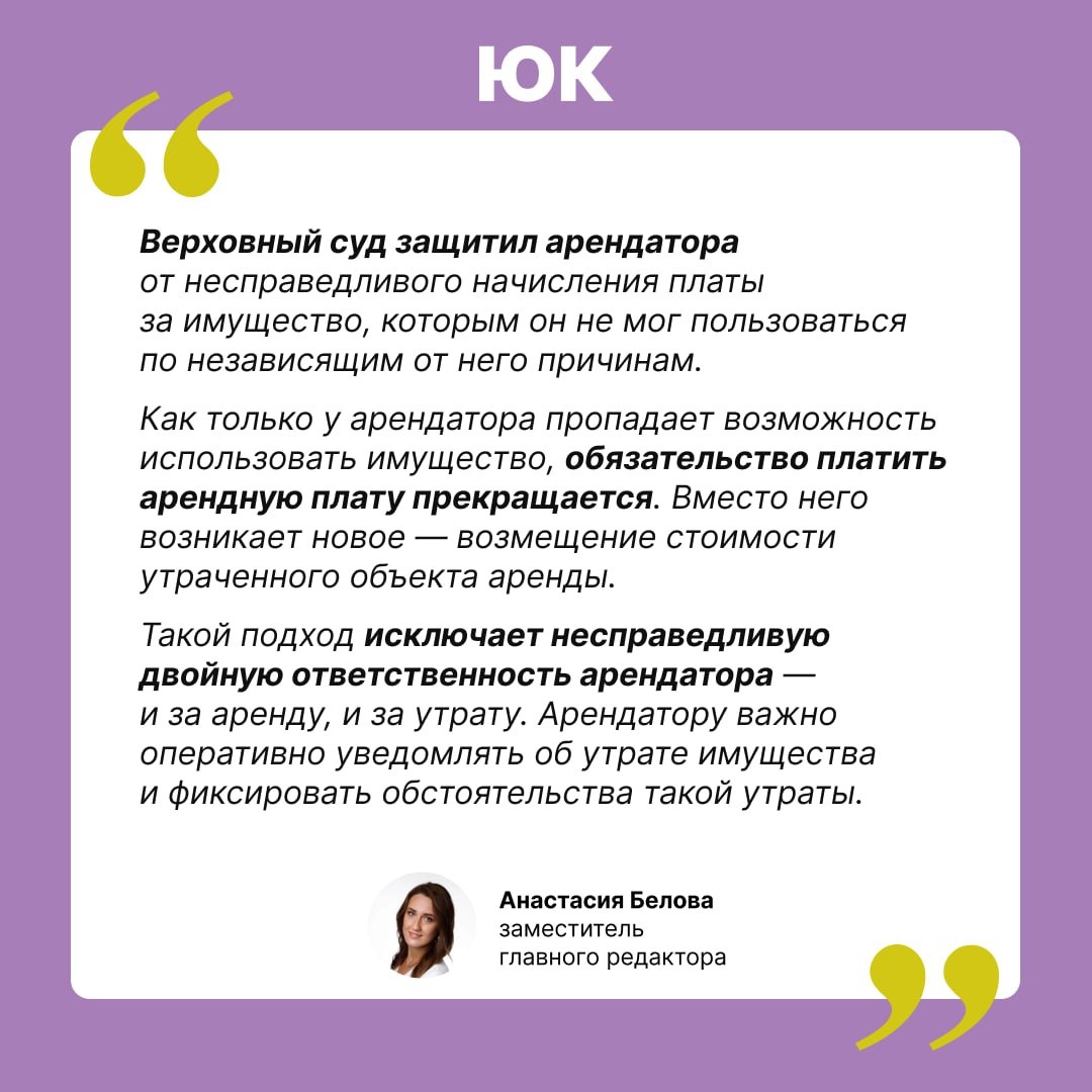 Арендатор не должен платить за период, когда не мог пользоваться имуществом по независящим от него причинам Верховный суд отменил решения трех инстанций, которые взыскали арендную плату за период, когда арендатор не мог использовать объект аренды ввиду его утраты по независящим от него причинам. При этом арендатор своевременно проинформировала арендодателя об утрате объекта аренды. 📌 ВС с позициями нижестоящих инстанций не согласился. Он напомнил: по общему правилу арендатор не обязан платить за период, когда не может пользоваться имуществом по независящим от него причинам. Если имущество утрачено и арендодатель об этом уведомлен, оснований для дальнейшего начисления арендной платы нет. ➡️ В итоге дело направили на новое рассмотрение — суду предстоит выяснить, когда арендодатель был надлежаще извещен об утрате предмета аренды и каковы были обстоятельства, исключающие возможность пользования (определение ВС от 03.07.2025 по делу № А01-458/2023). Мнение редакции читайте в карточке.