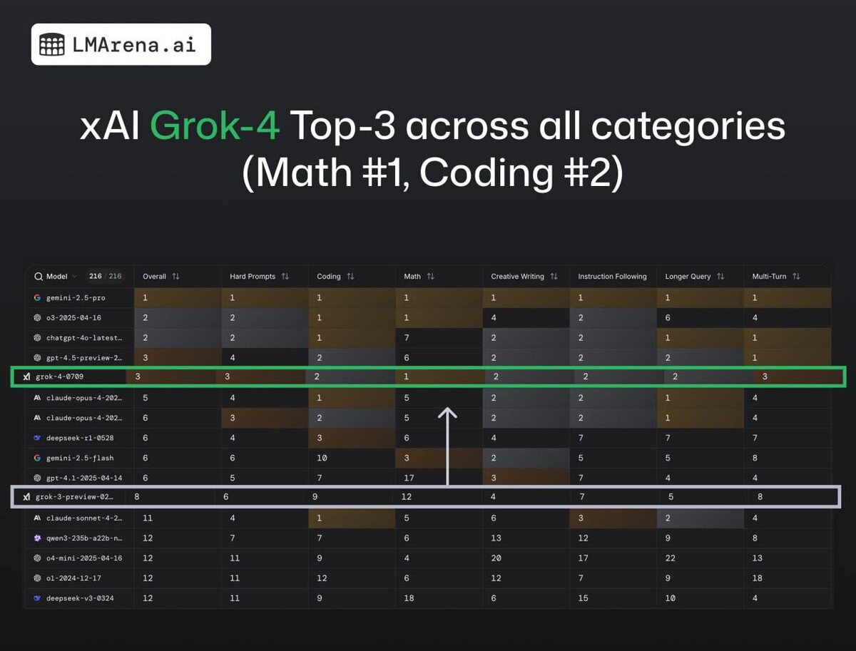 🥉Grok-4 не дотянул до вершины? В рейтинге LMArena, где пользователи анонимно оценивают ответы ИИ, новая модель Grok-4 от xAI Илона Маска