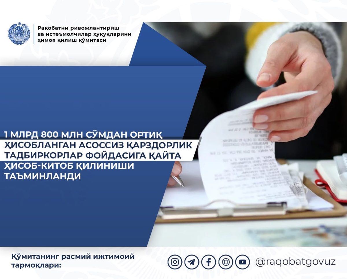 📎 Рақобат қўмитасининг Жиззах вилояти ҳудудий бошқармасига “Жиззах йўл қуриш таъмирлаш” МЧЖга “Ҳудудгаз Жиззах” газ таъминоти филиали томонидан асоссиз қарздорлик белгиланганлиги юзасидан тушган мурожаат ўрганиб чиқилди. Ўрганишларда мазкур МЧЖнинг абонент картасига амалда сарфланмаган табиий газ ҳажмлари киритиш орқали ундирилган 726 млн 314 минг сўм маблағ асоссиз эканлиги аниқланиб, тадбиркорлик субъекти фойдасига қайта ҳисоб-китоб қилиниши таъминланди.