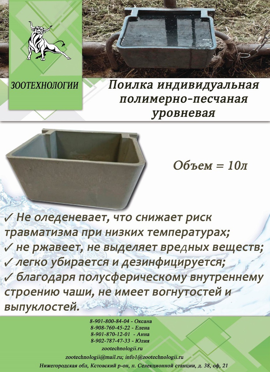 Здравствуйте. В продаже уровневая полимерно-песчаная поилка объёмом 10 литров, которая предназначена для обеспечения комфортного и гигиеничного водоснабжения крупного рогатого скота (КРС). Это индивидуальная автопоилка, которая используется в системах уровневого поения — оборудовании для привязного содержания КРС. Характеристики ✅Материал: полимерно-песчаный, толщина стенок — не менее 8 мм. ✅Форма: квадратная, упрощает установку и размещение в помещении. Особенности: ✅изолированность поилки от общей системы, что исключает риск заражения животных через воду; ✅сливное отверстие на дне поилки упрощает её очищение в случае загрязнения; ✅обратный клапан защищает трубопровод от засора; ✅возможность подогрева воды (опционально). Принцип работы: система наполняется водой в автоматическом режиме и поддерживает необходимый уровень для каждой коровы. Преимущества: ✅высокая прочность и устойчивость к коррозии благодаря стенкам из полимерного песка; ✅полусферическое внутреннее строение чаши,