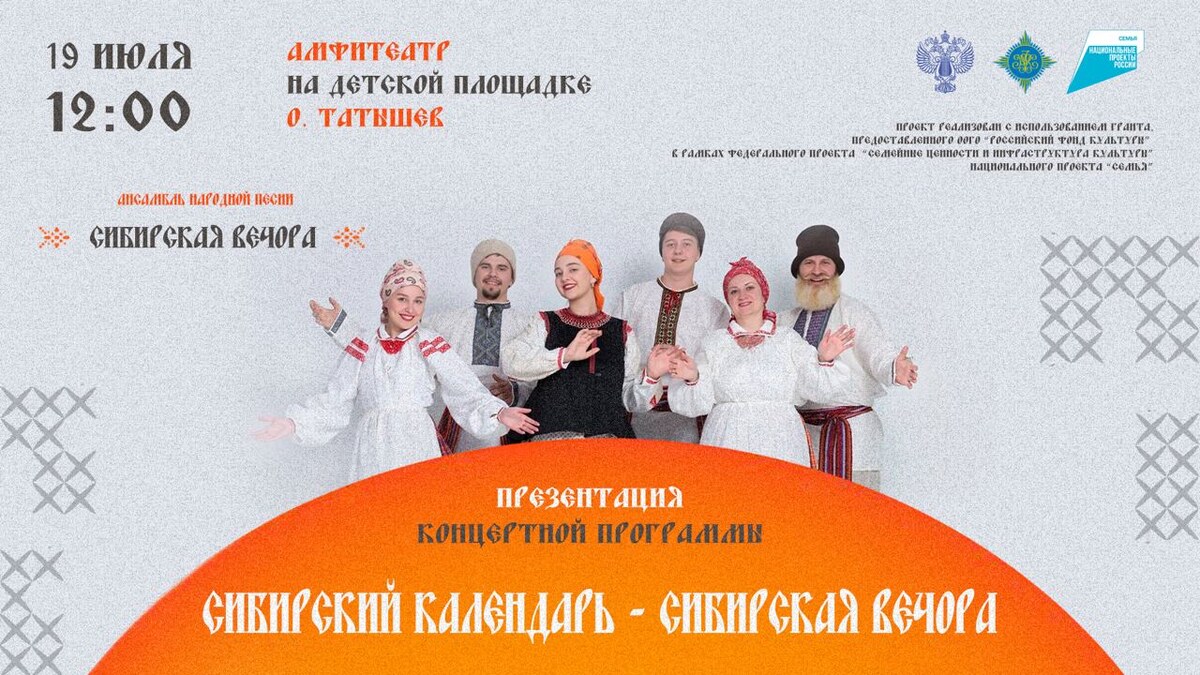 19 июля в 12:00 на площадке Амфитеатр на детской площадке, о. Татышев состоится презентация концертной программы «Сибирский календарь - Сибирская вечора».