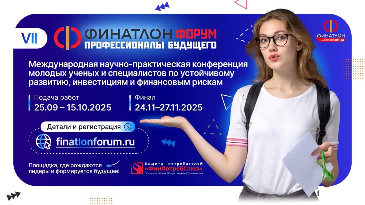 Регистрируйся на VII Финатлон форум – международную научно-практическую конференцию молодых ученых и специалистов по устойчивому развитию, инвестициям и финансовым рискам 📈 Календарь мероприятий Форума предусматривает следующие этапы: 🔗регистрация участников и подача научных работ с 25 сентября по 15 октября 2025 года 🔗отборочный тур в дистанционном формате до 5 ноября 2025 года 🔗финальный этап в смешанном формате с 24 по 27 ноября 2025 года Финатлон является признанной национальной площадкой для развития научно-исследовательского потенциала молодых специалистов в области финансовых технологий и устойчивого развития. Участие в Форуме способствует укреплению позиций российского высшего образования на международной арене и формированию нового поколения высококвалифицированных кадров. Актуальная информация о форуме доступна на официальном сайте: finatlonforum.ru, в группе «Финатлон» социальной сети ВКонтакте, в Telegram-канале @finatlonforum 🔗