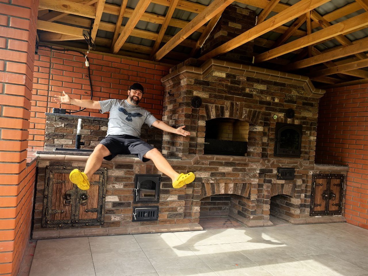 Сидеть на печи! Раньше это выражение означало ничего не делать, бездельничать, сейчас печь заменилась диваном 😉 Но я не бездельничал а готовил вам новое видео! Ведь сегодня четверг, а это значит, что вечером на YouTube оно выйдет. Ну а ещё хотел похвастаться своей печкой, пол почти уложил плиткой, установили столешницу с мойкой и кузнец из под Ржева сделал две замечательные дверцы. Останется только срезать балки и обшить крышу вагонкой под кровлю и застеклить беседку 😜👍