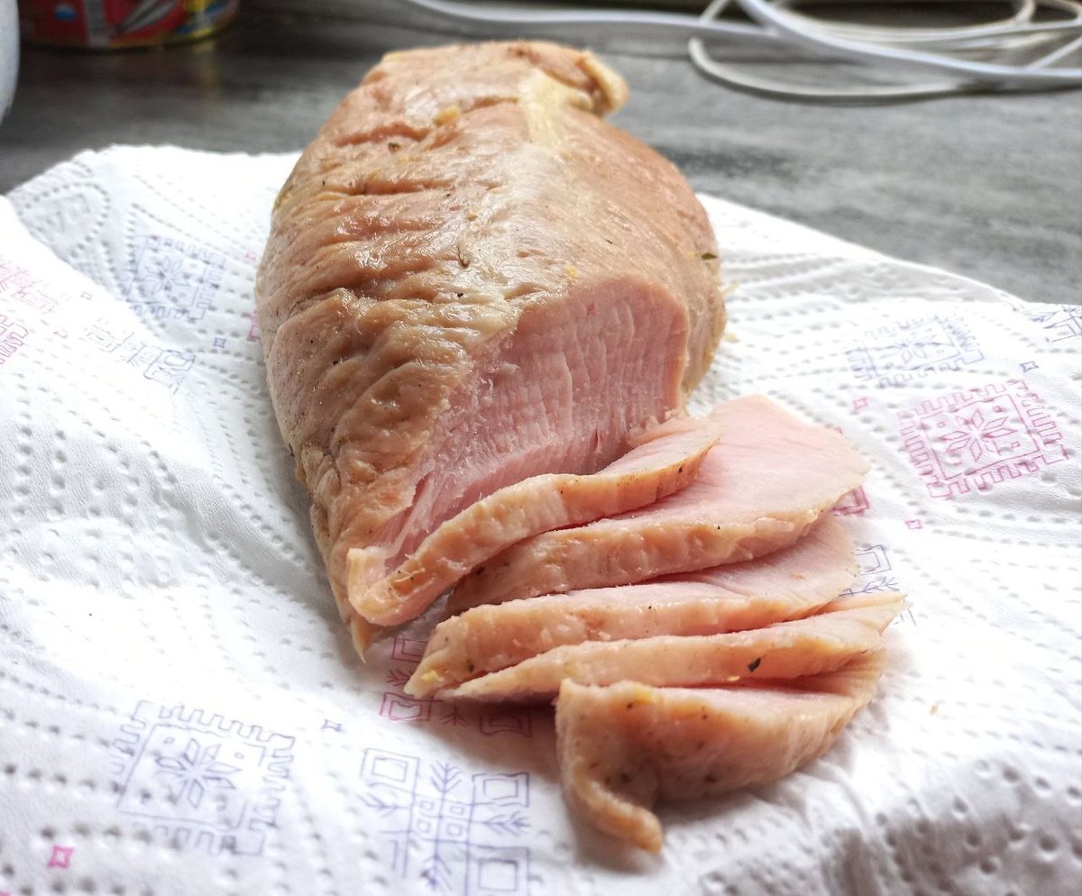 #грудка индейки #сувид Ну наконец-то я ее дожала👍👍👍. То есть никакого эффекта вареной птицы, цвет и вкус по типу магазинной грудки в/к. Маринуется по стандартному рецепту ТУТ, температура 56°C, время 3 ч 51 мин. Есть вариант с меньшим временем при толщине грудки 5 см, но я его еще не тестировала🤷♀. И еще. Я всегда кладу пакеты в воду комнатной температуры (вода из водомата) из-за того, что они нормально не вакуумированы. Если их положить в уже нагретую до 50° воду, то они начинают всплывать. Тогда надо не париться с пылесосом в качестве вакууматора, а просто выдавливать из них воздух с помощью воды (закон Архимеда из школьной физики🤭) Зы. И да, результат после опускания филе бедра в нагретую до 50° воду мне понравился несколько меньше, чем тот, как я делаю обычно - с водой комнатной температуры. Хотя он наверняка понравится любителям диетических вариантов😉