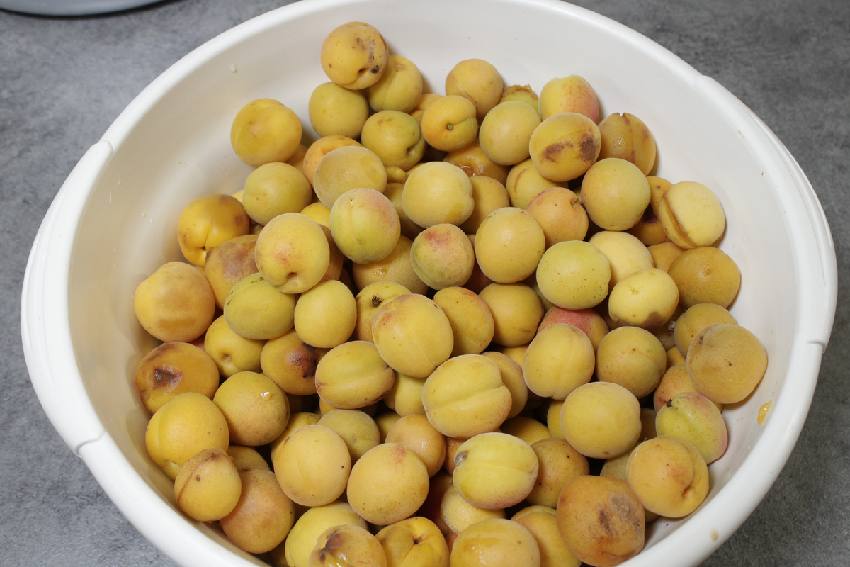 Каждый год готовлю по 30 литров! Домашний абрикосовый сок с мякотью. Рецепт абрикосового сока простой и быстрый, приготовит даже новичок! Сок получается ароматный, сладенький с лёгкой кислинкой, вкус насыщенный! Пошаговый рецепт: У меня в миске 6 кг небольших абрикосиков называются жердела, разной степени зрелости. Но лучше брать спелые плоды, тогда сок получается вкусный, ароматный, красивого желто-оранжевого цвета. Хорошо промываем их под проточной водой. Отделяем косточки. В итоге у меня осталось 5200 гр абрикосов и 800 гр косточек. Заливаем плоды чистой водой так, чтобы покрывало на 2 -3 см. Это обычно составляет такое же количество, сколько плодов. Я добавила 5 литров воды. Ставим на плиту доводим до кипения и помешивая провариваем минут 5 -10, вот до такого состояния абрикосов. Пенку образовавшуюся с верху снимать не надо. Пробиваем блендером, что бы легче было протереть через сито. Получившуюся массу протираем через сито или дуршлаг, отделяем от жмыха. Эта процедура занимае