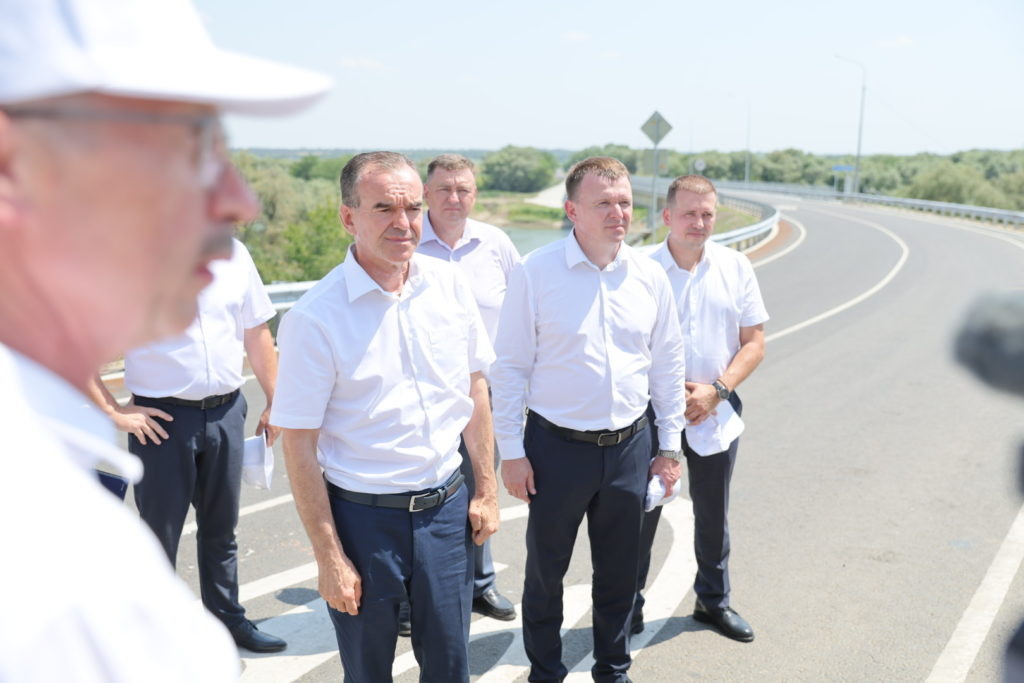 Вениамин Кондратьев во время открытия движения по новому мосту через реку Кубань в Усть-Лабинском районе.