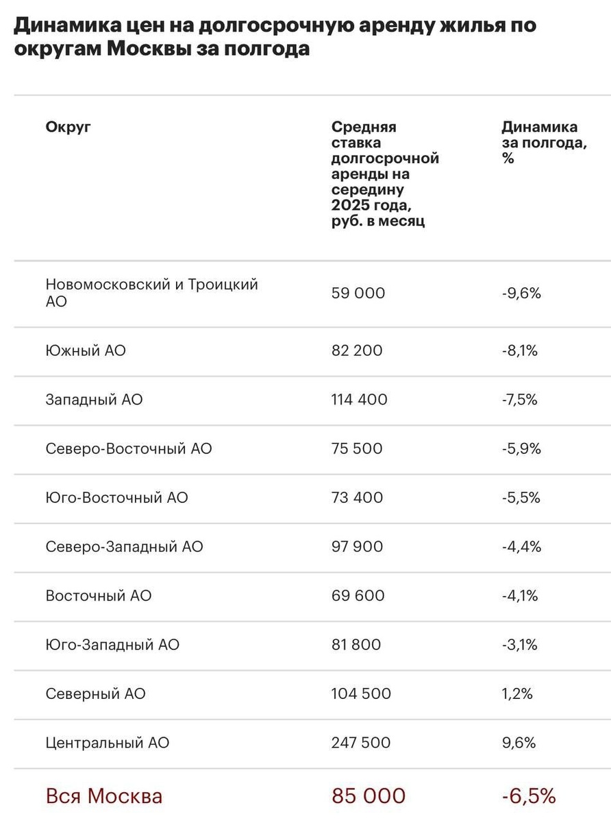 По эксклюзивной информации от аналитиков сервиса «Яндекс Аренда», ставка долгосрочной аренды типовой квартиры в Москве в июне 2025 года составила 85 000 рублей в месяц. За предыдущие шесть месяцев динамика оказалась отрицательной, чего не наблюдалось на протяжении последних лет: арендные ставки снизились сразу на 6,5%.
