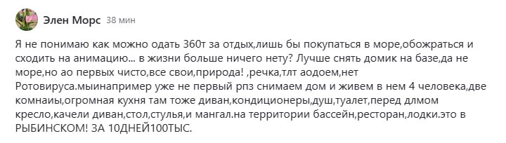 «Не понимаю, как можно отдать 360 т. за отдых, чтобы покупаться в море... Лучше снять домик на базе: речка, душ, туалет, мангал...»
