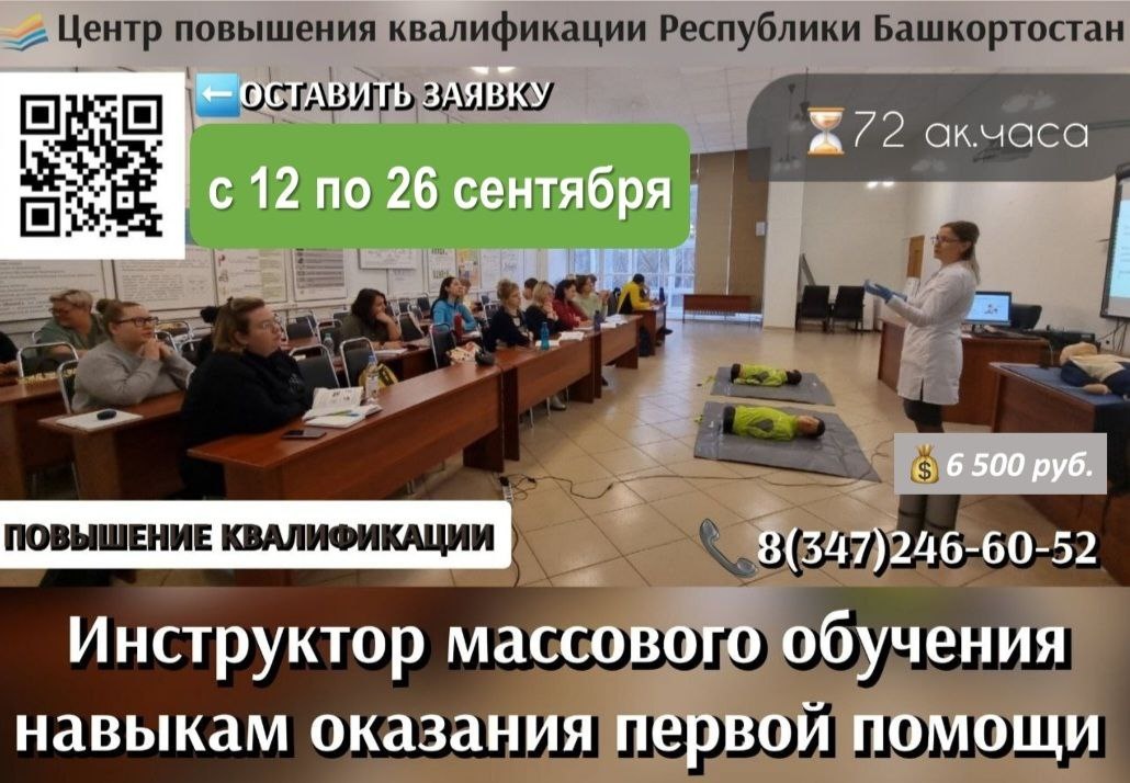 ✨Приглашаем вас на актуальное и востребованное обучение! 📚Центр повышения квалификации проводит обучение по программе «Инструктор массового обучения навыкам оказания первой помощи» для всех групп населения, организаций (с учетом специфики профессий). 👩🏫👨🏫Преподаватели Центра являются практикующими врачами, инструкторами по первой помощи. Навыки и умения оказания первой помощи отрабатываются на современных тренажерах, манекенах высокой реалистичности. 📅Ближайшие сроки обучения: с 19 по 26 сентября 2025 г. 📃Лицам, успешно прошедшим обучение, выдается документ установленного государственными законодательными актами образца. ✏️Форма обучения – очно-заочная. ⏳Продолжительность обучения: 72 ак. часа. 💰Стоимость: 6500 руб. 💻Заявки принимаются по адресу электронной почты: manager@medupk.ru или по 📞телефону 8(347)246-60-52. ➡️А также заявку можете оставить в нашей Telegram-группе по ссылке: https://clck.ru/3AKucV #центрповышенияквалификации #цпк #повышениеквалификации